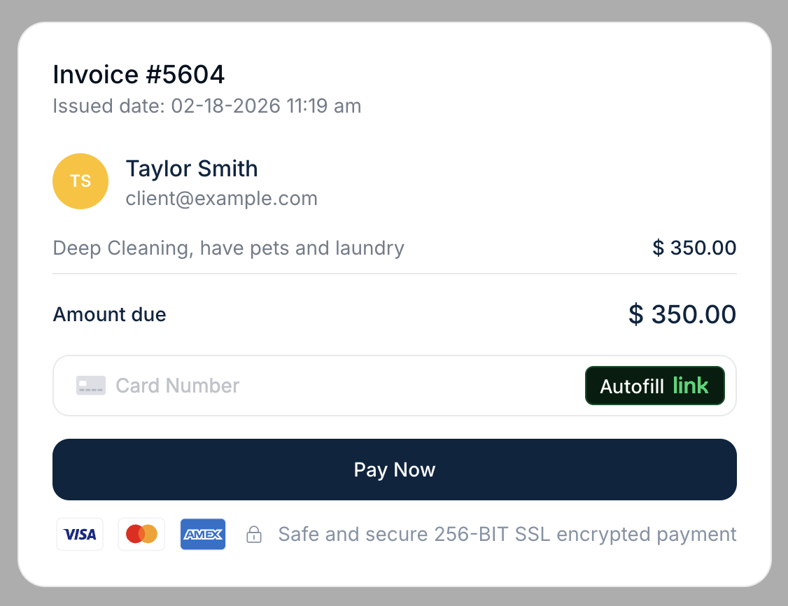When the customer clicks “Pay” a secure payment page opens in a new browser tab. This page displays the complete invoice summary and provides a field for entering payment details.