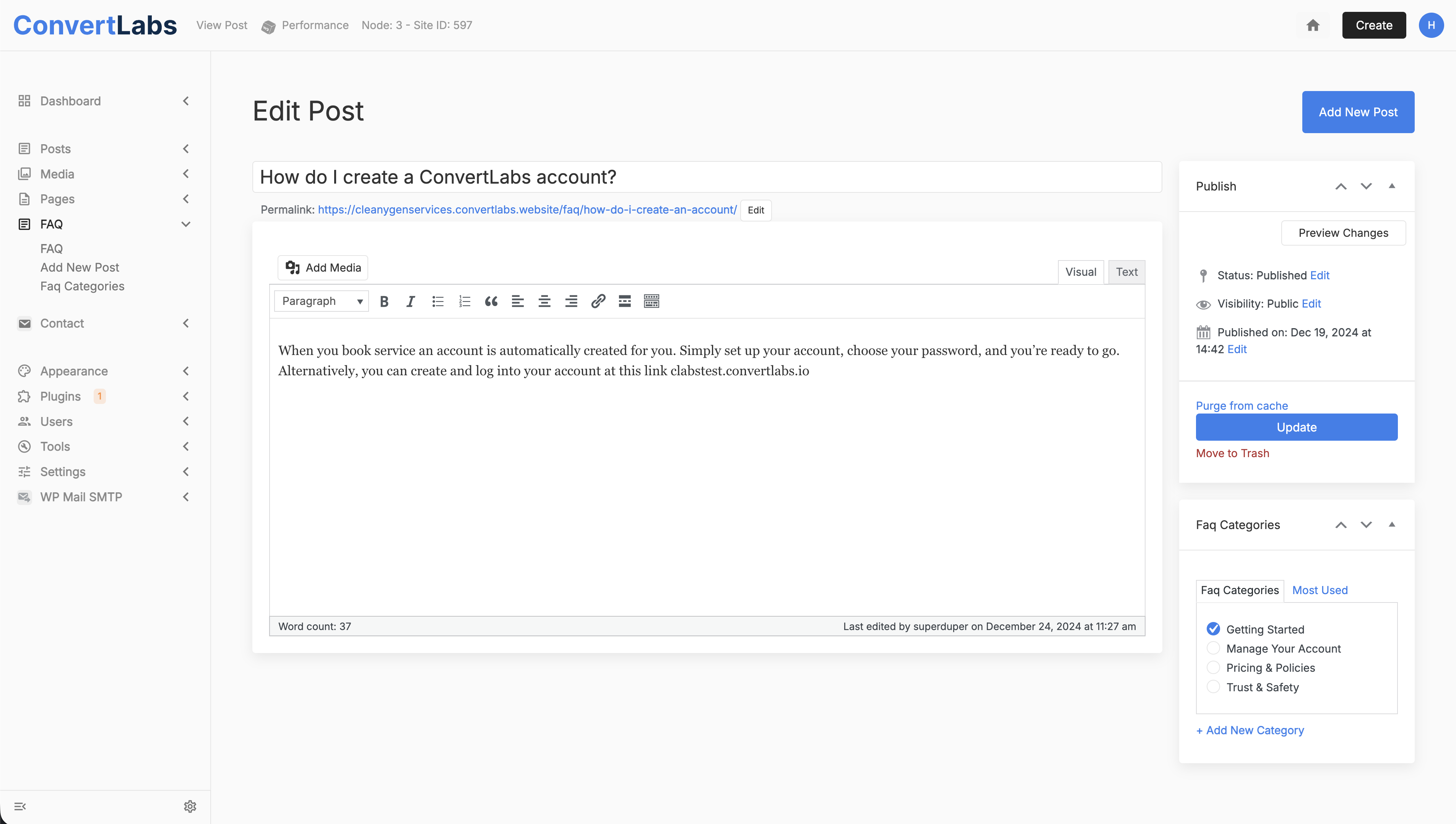 - From here, you can edit existing FAQs, create new questions, or manage Faq categories.