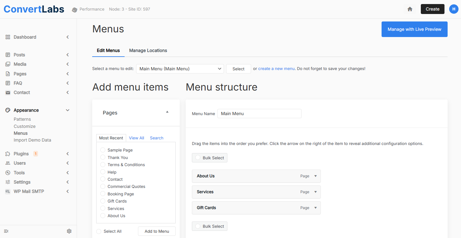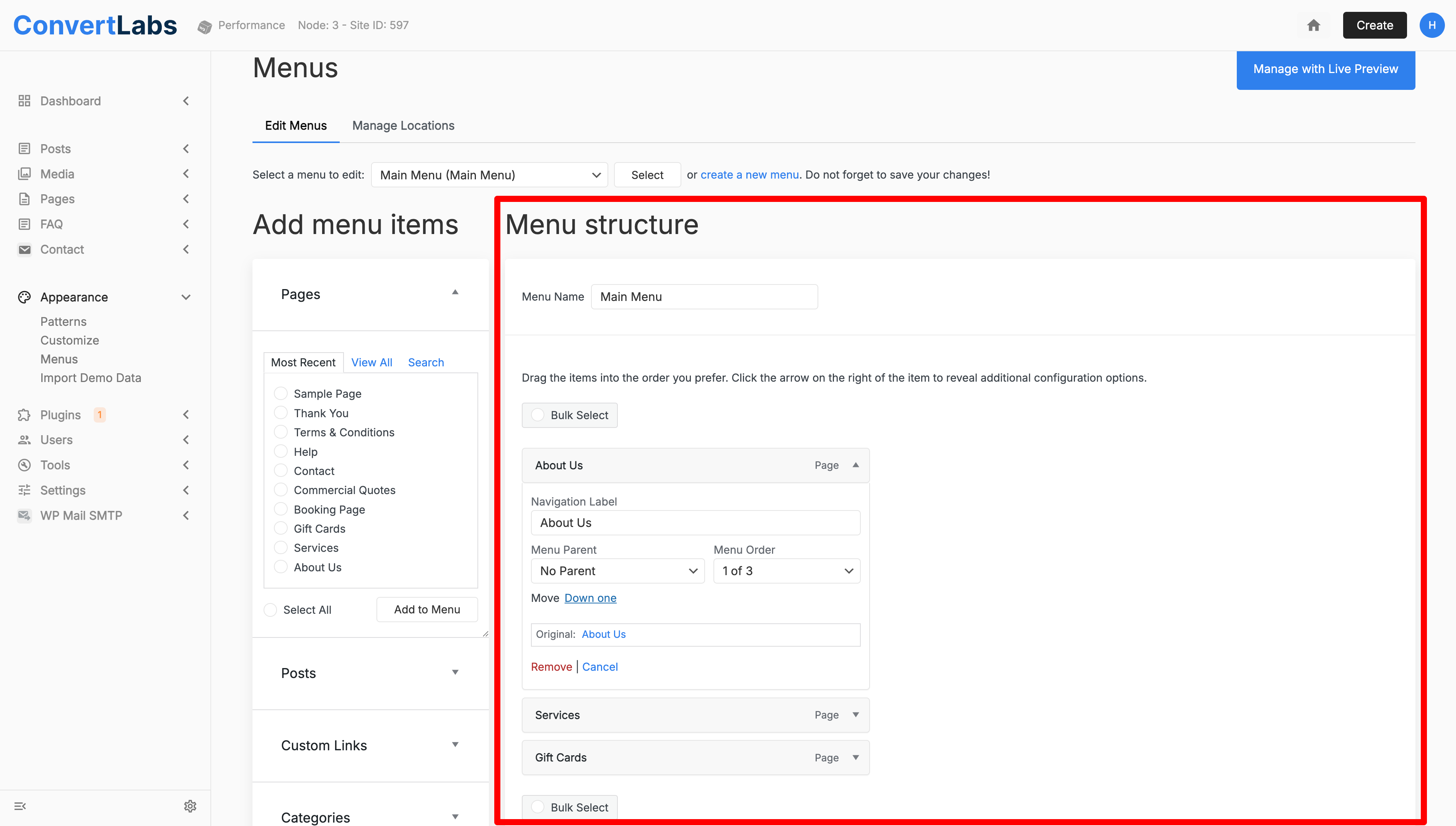 The Menu Structure section displays all items currently included in the menu. From here, you can organize and customize how the menu appears on your website.